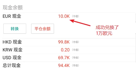 进入投资组合页面后,选择指定币种,如想要把美元兑换成欧元,则选择美元,如下图:
