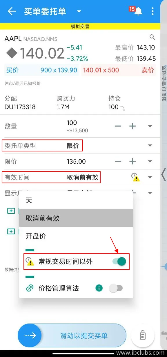交易美股(如AAPL苹果股票),想要盘前盘后交易(仅接受LMT限价单),还必须勾选【常规交易时间段外成交】选项: