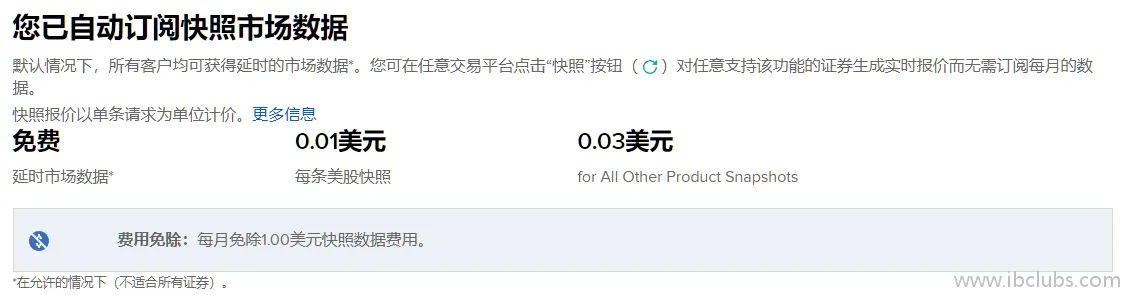 顶部的【快照市场数据】,相当于【瞬时市场截图】,当用户在报价窗口主动点击【刷新】按键时,会刷新该时间点瞬间的报价、挂单数量等,每个月免费请求100次,超出部分每次按0.01刀计算费用,这个是盈透考虑到不频繁交易用户的需求。此项目不可取消,用户不主动点击,不收任何费用。