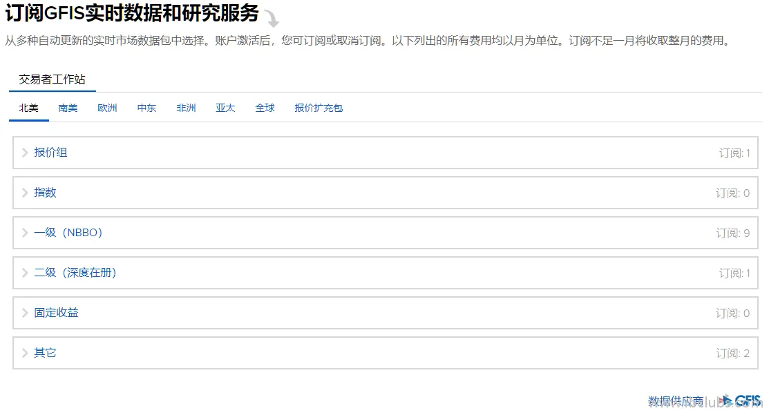 - 美股期权包 (1.50刀/月):OPRA (US Options Exchanges),提供来自AMEX、ARCA、BATS、BOX、BSE、CBOE2、CBOE、ISE NASDAQ及PHLX的期权数据。(月佣金满20免1.50刀数据费)