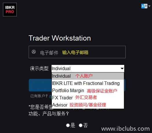 注意,演示类型有好几种,其中第一种是我们个人用户【Individual】,第三个【Portfolio Margin】是针对净资产超过11万刀的高级保证金账户;第五个【Advisor】是顾问账户类型。