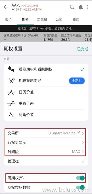 选择某个股票代码,如AAPL后,在左上角的下单栏的右上部分,点击【期权链】: