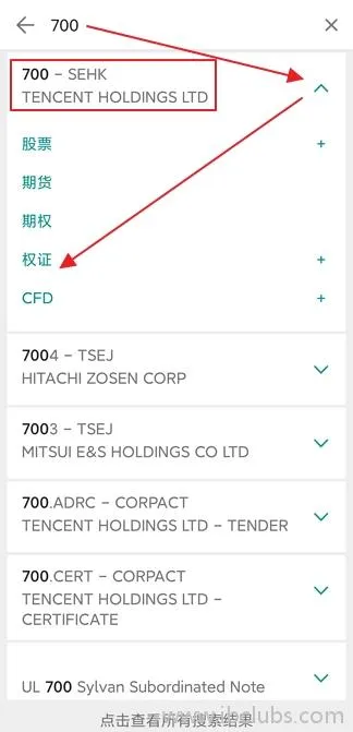 首先输入港股代码,注意要去掉代码前面所有的0,如腾讯是00700,则只需要输入【700】即可,随后选择【权证】: