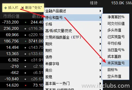 首先,我们必须调出这个【未实现盈亏】栏目,如下所示,鼠标移动到【市场价值】或【最后价】的地方,悬停1-2秒,出现【插入栏】选项,再选择【持仓和盈亏】,接着选择【未实现盈亏】: