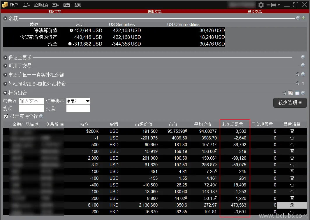 调出之后,我们就可以看到所有持仓头寸的未实现盈亏/浮盈浮亏: