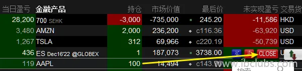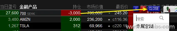 单笔交易/头寸的平仓,与开仓一致,只是买卖方向相反。如果想【全部平仓】某个产品(如腾讯股票、标普500期货),首先鼠标移到【投资组合】下面的头寸位置,点击鼠标右键,选择【CLOSE】或【关闭】这个选项。如下图: