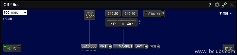 当前持有3,000股腾讯700的空单,蓝色CLOSE代表买入平仓,订单输入栏中,会直接设置好交易数量、市价单等参数,点击右下角的【提交】就能发订单出去: