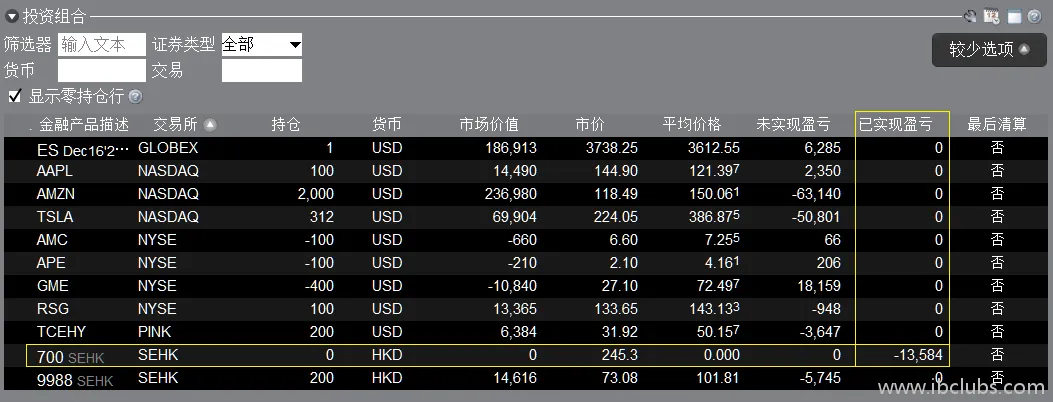 如下图,【投资组合】即当前持仓情况,注意,其中的金额都是按照产品的本币计算,如美股是按美元,港股按照港币,日股按照日元等。最后一行的【最后清算】可以改为是,当账户资金不足,开始被IB强平时,则勾选为是的头寸,会被最后平仓。此外,如果没有头寸增加变化,则该窗口约3分钟左右更新一次: