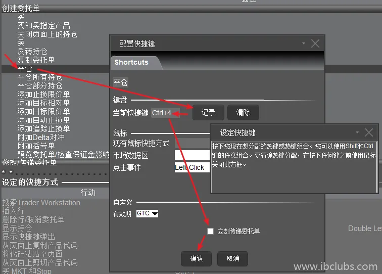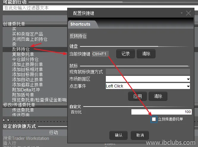 然后再点【自定义】,进入设置快捷键的配置界面。如果之前给其他产品预设过参数(如止盈止损),则这里的只需要填写左边的主订单即可。如果之前没有设置过预设参数,则视需求设置右边的止盈止损单。另外,如果不想手动点击提交发送订单,则可以勾选【立刻传递订单】: