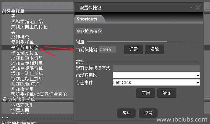 如下图所示,快捷键中选择【平仓】,代表平仓某一个产品的全部头寸: